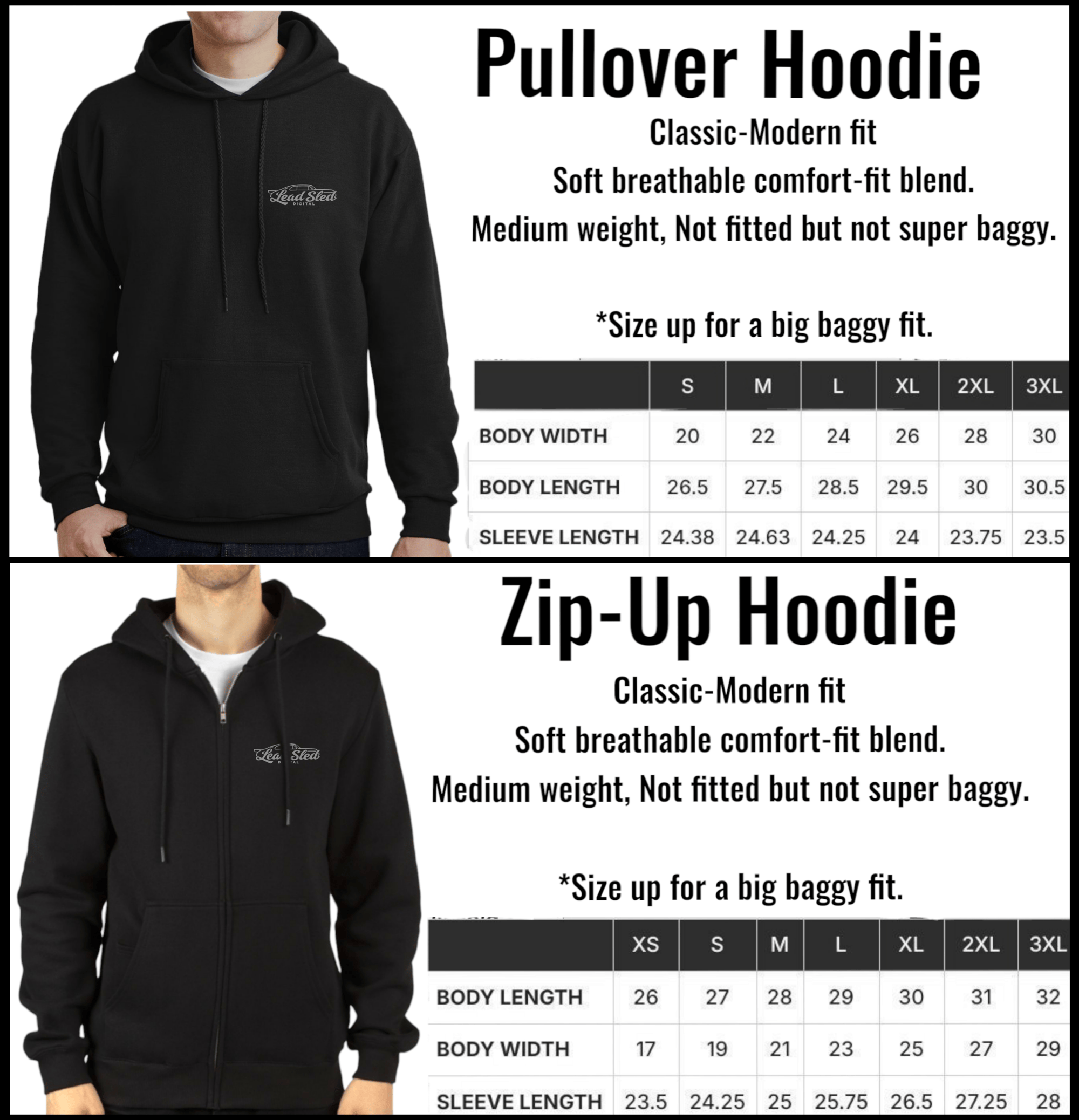 Hoodies run average/classic in fit. Not oversized. For a bigger baggy fit, order one size up.